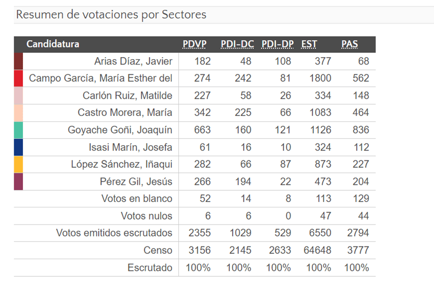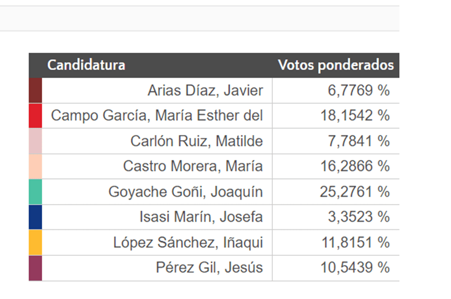 Las tablas que siguen muestran los resultados ponderados y la votación por sectores