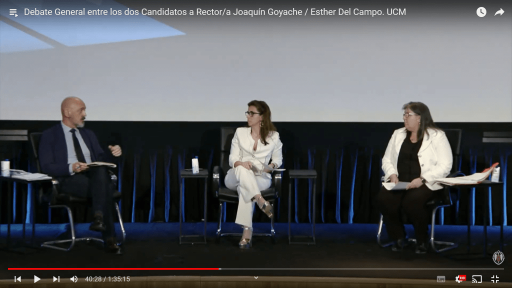 Esther del Campo, que estuvo esta vez más nerviosa que en los debates anteriores y que utilizó algo más de lo debido el recurso a la lectura de sus intervenciones, tuvo, de principio a fin, la habilidad de presentarse como una candidata con mucho apoyo de la comunidad universitaria, abanderando el descontento con la gestión de Goyache, en nombre de su alianza, actuando más como portavoz de ésta, que de su Compromiso Complutense. Este compromiso era sólo el suyo y, en materia de gestión universitaria no pasaba de su buen decanato en la Facultad de Ciencias Políticas y Sociología. Pero, ahora, tiene en su rincón, la experiencia de dos excandidatos que han sido vicerrectores y la de un tercero que destaca en el terreno de la investigación. Cuidó mucho, en todo momento, de presentarse como una candidata de mayorías con un sólido respaldo de votos en la primera vuelta de las elecciones.