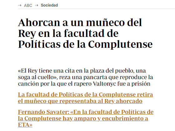 El pasado día 13 de abril, se produjo un hecho totalmente reprobable. Apareció en la Facultad de Ciencias Políticas y Sociología un muñeco ahorcado de un rey, junto a una pancarta con la letra de una canción del rapero Valtonyc. Ante ello, el decanato actuó con rapidez. Retiro ambas cosas, condenó el hecho públicamente y ofreció toda su colaboración para la investigación que al efecto se ha puesto en marcha por la Policía Nacional. Pero, rápidamente, la asociación Libertad Sin Ira, denunció los hechos ante el juzgado y dijo en en Twitter “Las instituciones no pueden seguir tolerando la violencia contra el Estado. La universidad democrática debe ser el núcleo de la defensa de la Libertad y la Constitución en España”. A continuación, como era de esperar ABC, publicó: