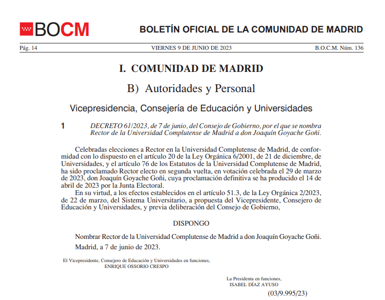 En el Boletín Oficial de la Comunidad de Madrid (BOCM) del 9 de junio de 2023, se ha publicado el DECRETO 61/2023, de 7 de junio, del Consejo de Gobierno, por el que se nombra Rector de la Universidad Complutense de Madrid a don Joaquín Goyache Goñi.