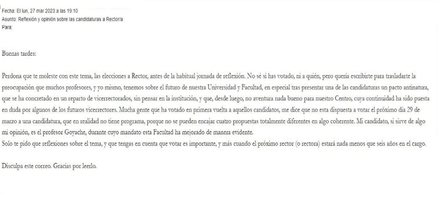 Pero, lo más sangrante es que, al responder solamente a esto, se esquivó el otro incidente mencionado por Tejada, sobre los que la Universidad Complutense no tiene que abstenerse por existir prejudicialidad (no ha intervenido la policía ni la fiscalía, ni los jueces) y podría muy bien haberse actuado de oficio. Resulta que un decano escribió a sus alumnos utilizando su correo profesional, como profesor de la Complutense, pidiendo el voto para Joaquín Goyache.