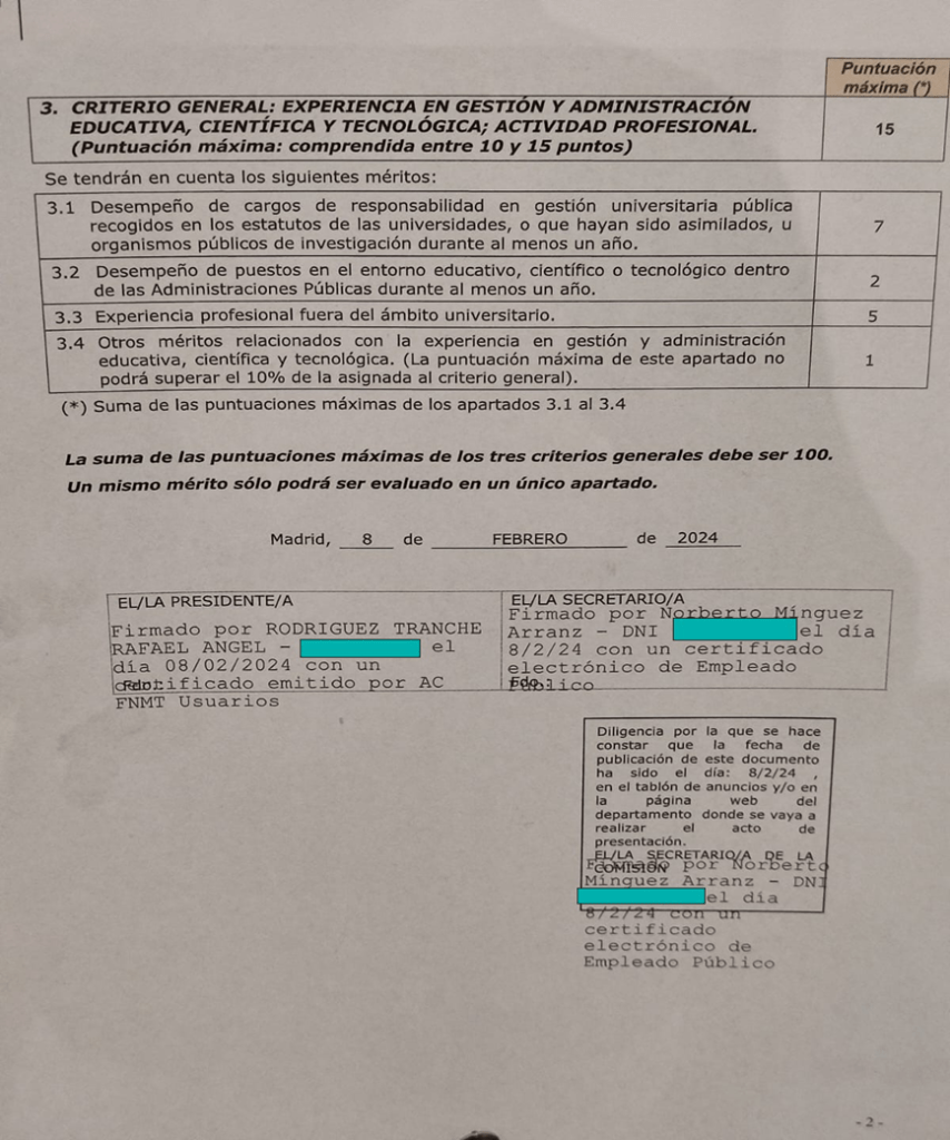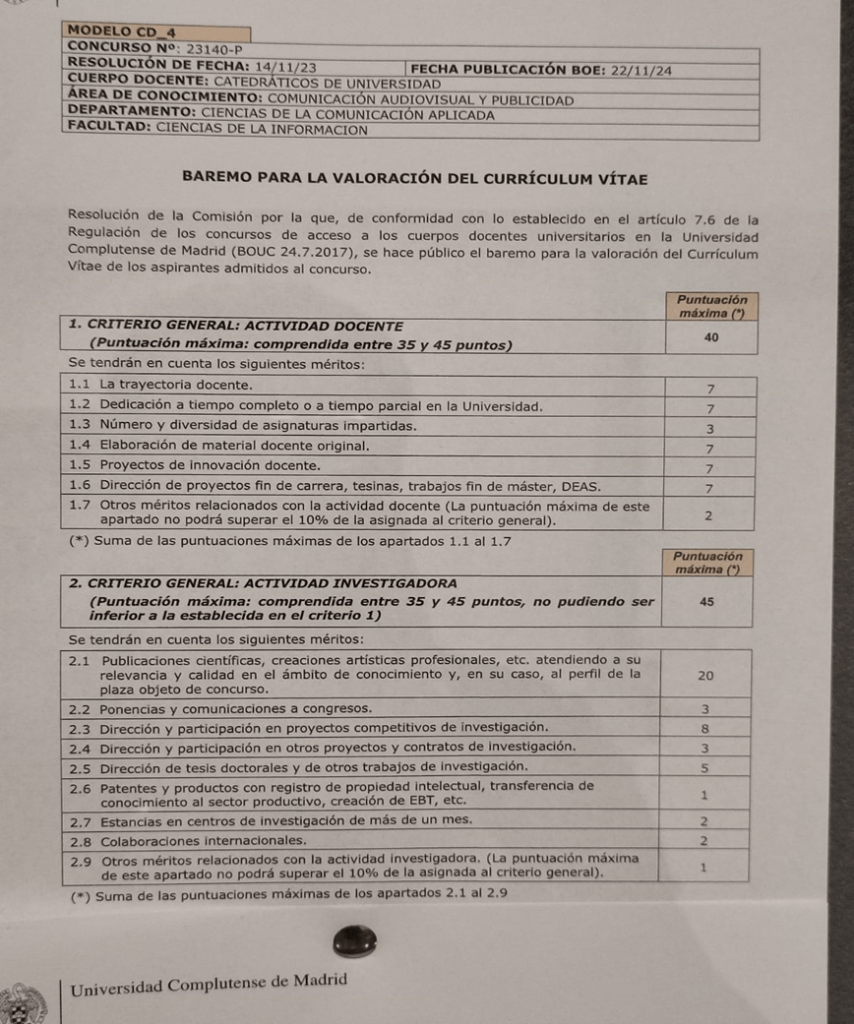 Finamente, por lo que respecta a este baremo, vuelvo a lo dicho sobre los cargos unipersonales: los méritos derivados de estos cargos deberían ser evaluados únicamente en el tercero de los apartados, nunca en la trayectoria docente y tampoco en la actividad investigadora.