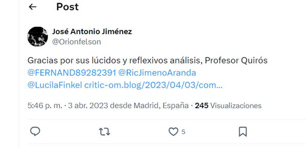 En 2023, este hombre honesto lanzó una avalancha de elogios sobre mi, dignos de una ovación cerrada: brillante, lúcido, modélico, necesario… palabras que me pintan como una referencia absoluta. Pero, ay, qué decepción, en 2025, el mismo escenario se transforma en un páramo otoñal de ranciedad y ruido: “no tengo ganas, ni fuerzas de comentar ese otro blog otoñal, una reliquia, que a veces nos divierte y otras nos saca una mueca de contrariedad ante la ranciedad, zafiedad y patetismo de sus afirmaciones, tan gratuitas como las del libelo, pero por desgracia firmadas de puño y letra por alguien progresivamente irrelevante, pero que gusta de ensuciar y hacer ruido, cuando antes debería mirar sus propias miserias… si las tuviera”.