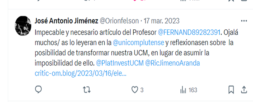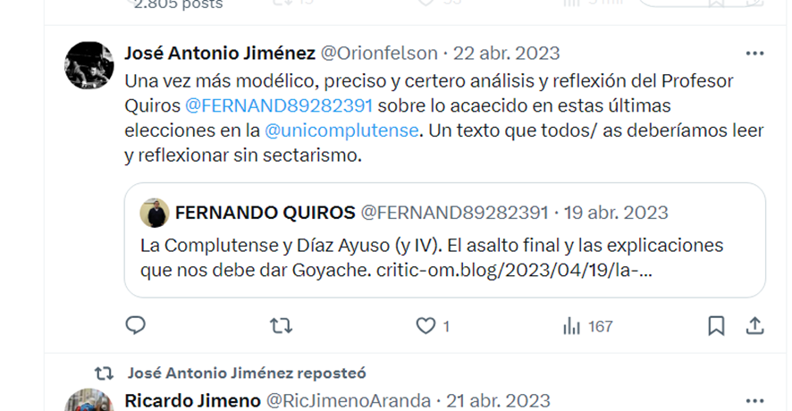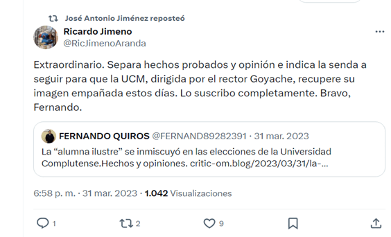 José Antonio posee un sentido del humor envidiable, tan afinado que le permite decir hoy lo contrario de lo que dijo hace dos años, sin pestañear. Es un talento raro, poder cambiar de opinión con tanta fluidez y naturalidad, casi como si no hubiera dicho lo anterior con absoluta convicción. Un verdadero maestro de la coherencia dinámica. Y para disipar cualquier duda, salgo en su defensa con pruebas irrefutables: lo que él mismo expresó públicamente en su cuenta de X (cuando aún era Twitter), sobre mis artículos en las elecciones a rector y en el asunto de Ayuso. Ahí lo tenéis, sin filtros ni interpretaciones malintencionadas. Tomaos un rato para leer lo que José Antonio dice de mí en estas capturas de pantalla.