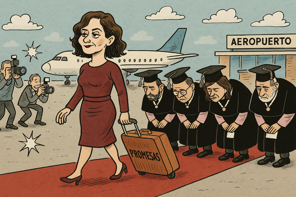 Porque al final, en medio de este despliegue diplomático tan bien iluminado, queda una pregunta aún sin respuesta: ¿qué pintan exactamente ahí esos cuatro rectores de las universidades públicas madrileñas? Su presencia no solo desentona, sino que compromete. En lugar de defender a sus instituciones, se prestan a blanquear una estrategia política que ha hecho de la universidad pública su blanco predilecto. Su silencio, lejos de ser neutral, es elocuente. Porque cuando se deja de representar con dignidad aquello que se dirige, lo que queda ya no es rectorado: es sumisión.